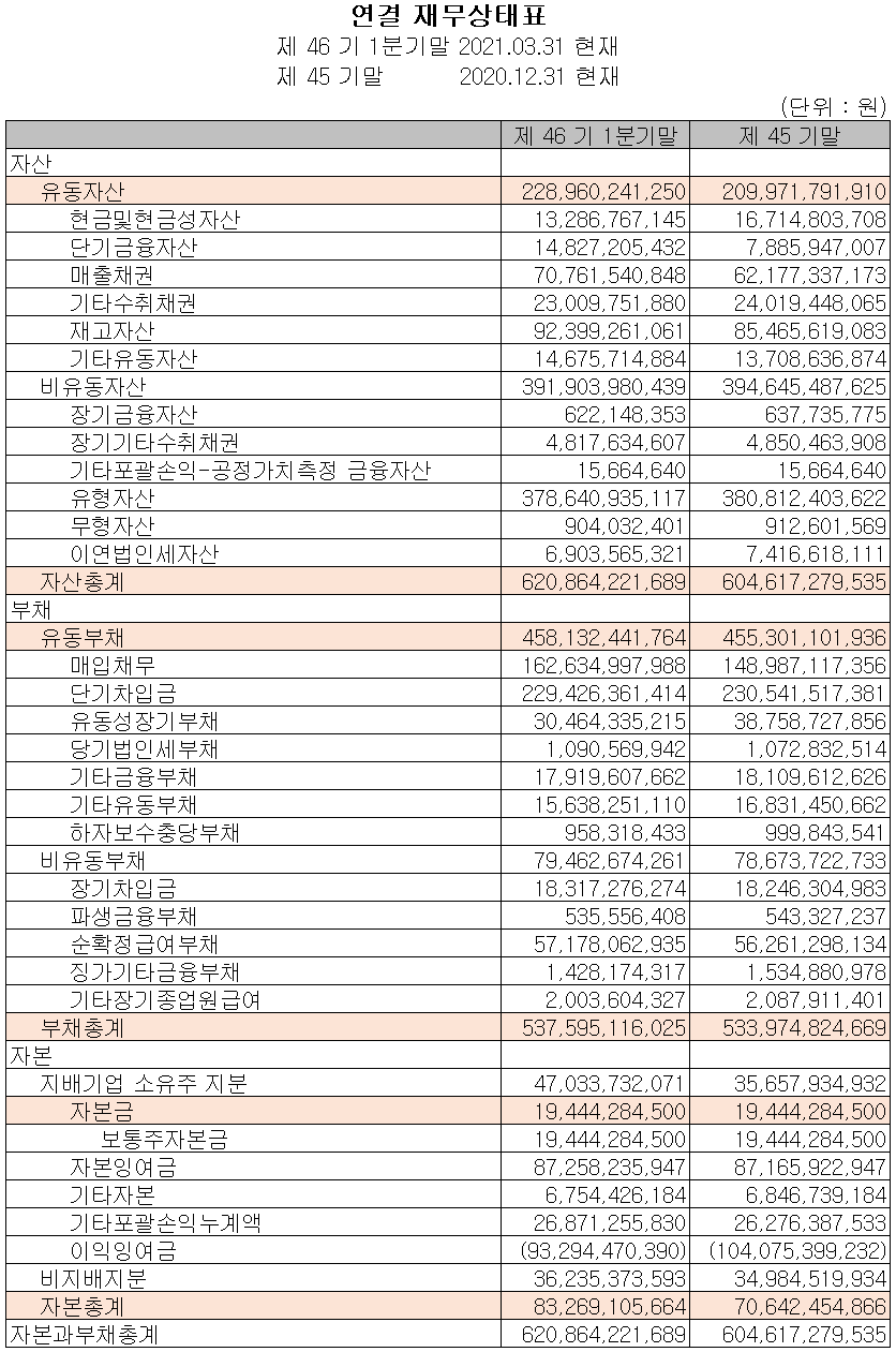 지난 1분기 자산 총계는 전기보다 2.7%(162억 원) 증가한 6,209억 원으로 매출 채권, 재고 자산 등의 증가에 기인합니다. 부채 총계는 0.7% 증가한 5,376억 원을 기록했습니다.