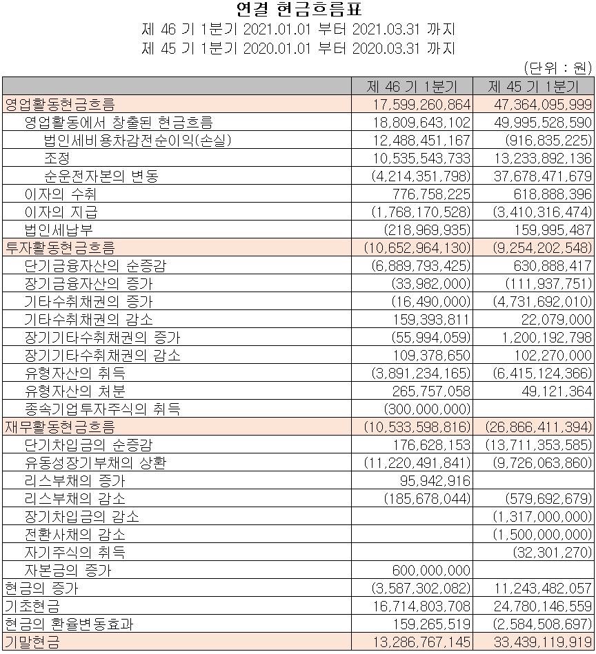 지난 1분기 영업활동 현금흐름에서는 총 176억 원의 현금이 유입되었습니다. 차입금을 조달하고 부채를 상환하였으며, 유무형 자산의 취득이 있었습니다. 2021년 1분기 말 기준 현금성 자산은 전년 동기 대비 202억 원 감소한 133억 원을 보유하고 있습니다.