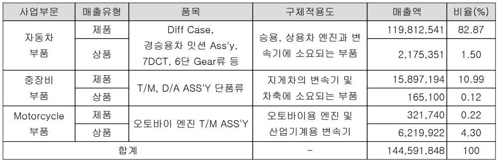 당사는 자동차 변속기, 경승용차의 미션 및 Differential Ass'y 등 자동차 부품의 제조 및 공급을 하는 단일 사업부문으로 구성되어 있습니다. 지난 1분기 승용 및 상용차의 엔진과 변속기 관련 부품의 매출은 1,220억 원으로 전체 매출의 84.4%를 차지하였으며, 지게차 등 중장비 부품은 161억 원으로 11.1%, Motor Cycle 부품은 65억 원으로 4.5%의 매출 비중을 나타냈습니다. 또한 지난 1분기 당사의 수출과 내수의 비중은 각각 55.8%, 44.2%를 기록했습니다.