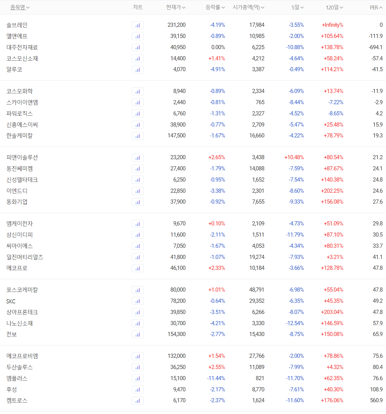 전기차 배터리 소부장(소재 부품 장비) 관련주들은 대부분 그동안의 급등에 대한 조정 장세를 이어가는 모습입니다. 2차전지 관련 업종에 대해서는 시가총액이 큰 기업들 순으로 3분기 실적 발표에 따른 대응을 해야겠습니다. 그중에서도 저 PER 주면 더 좋을 듯합니다.