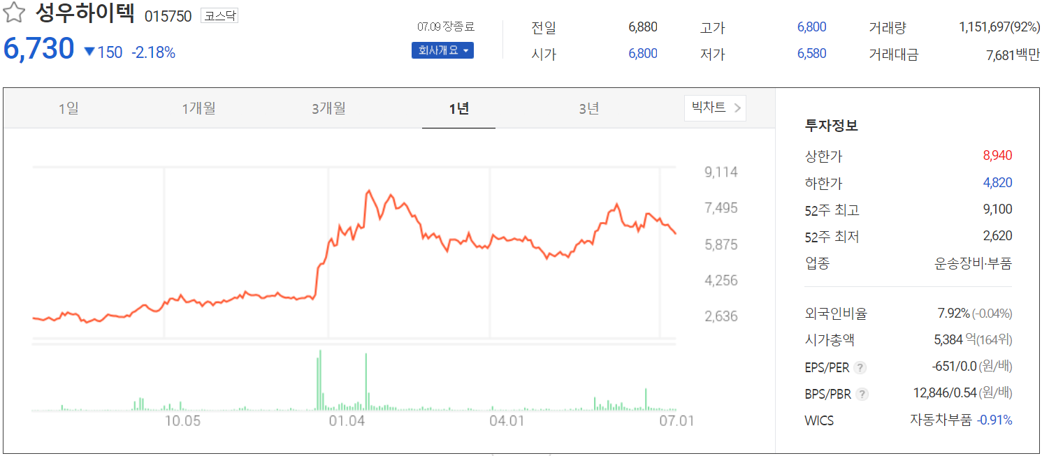7월 9일 장 종료 기준 당사의 주가는 전일보다 2.18% 내린 6,730원에 거래를 마감했습니다. 외국인 비중은 7.92%이며, 시가 총액 5,384억 원으로 코스닥 시총 상위 164위 종목입니다.