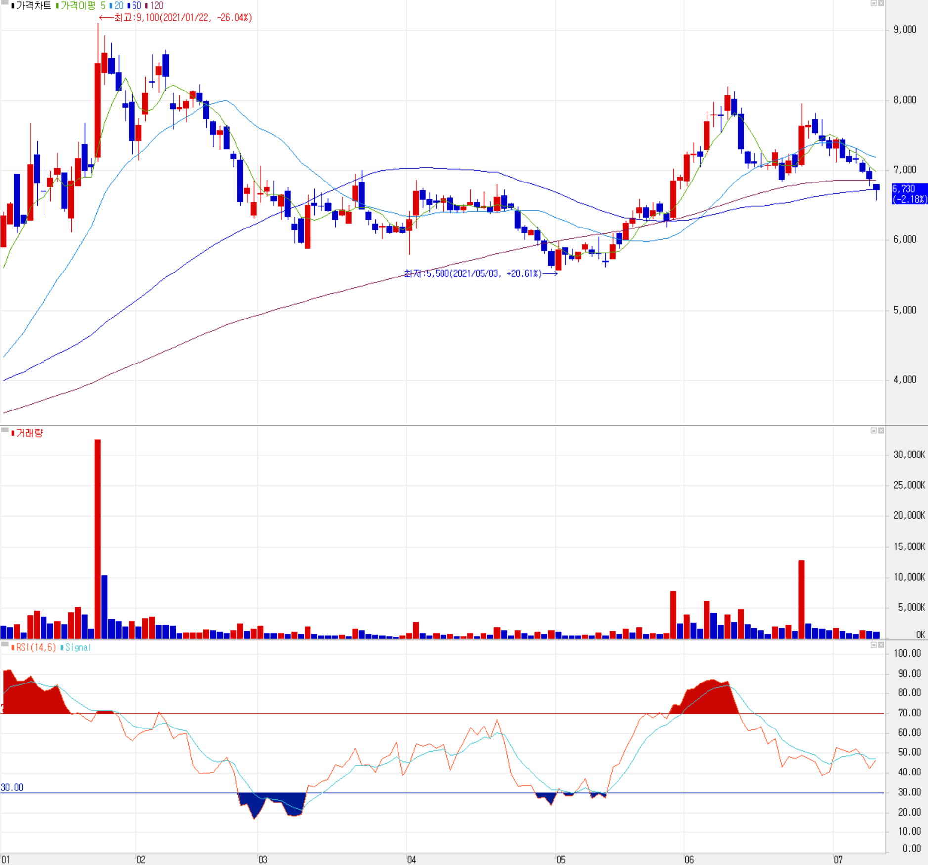 당사의 주가는 지난 1월 글로벌 완성차 업체인 미국 GM의 전기차 차체 및 배터리 케이스의 수주에 따른 공장 설립 소식에 최고가인 9,100원을 기록한 이후 조정을 받다가 지난 5월부터 반등하였으나 최근 하락세를 보이면서 6천 원 대 후반에서 주가가 형성되고 있습니다. 최근 수급에서는 6 거래일 연속 순매수하는 개인과 기관이 꾸준한 매수세를 보이는 가운데 외국인은 매도로 대응하는 장세가 지속되고 있습니다. 차트 소견 상 개인적인 목표주가는 8,200원으로 설정하였으나, 6,500원 선을 지지하고 반등 여부 확인 후 진입하는 게 좋겠습니다.