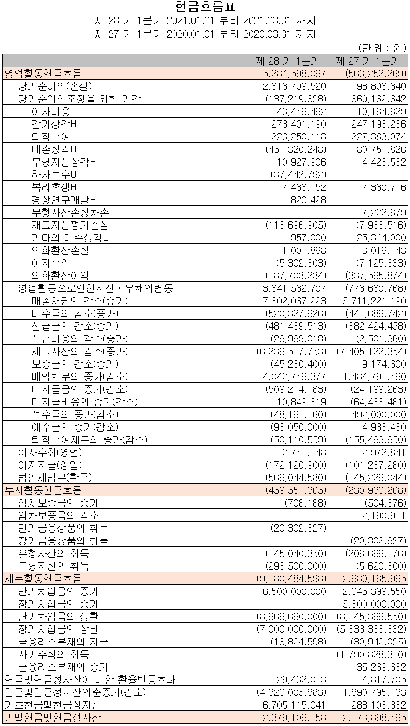 당사의 지난 1분기 영업활동 현금흐름에서는 당기순이익 및 운전자산의 변동에 따라 총 53억 원의 현금이 유입되었습니다. 재무활동에서는 차입금을 조달하여 부채를 상환하였으며, 투자활동에서는 유무형 자산의 취득이 있었습니다. 2021년 1분기 말 기준 현금 및 현금성 자산은 전년 동기 대비 2억 원 증가한 24억 원을 보유하고 있습니다.