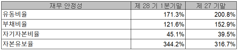 2021년 1분기 재무 안정성 비율에서는 유동비율 171.3%, 부채비율 121.6%, 자기 자본비율 45.1%, 자본 유보율 344.2%를 기록하였습니다.