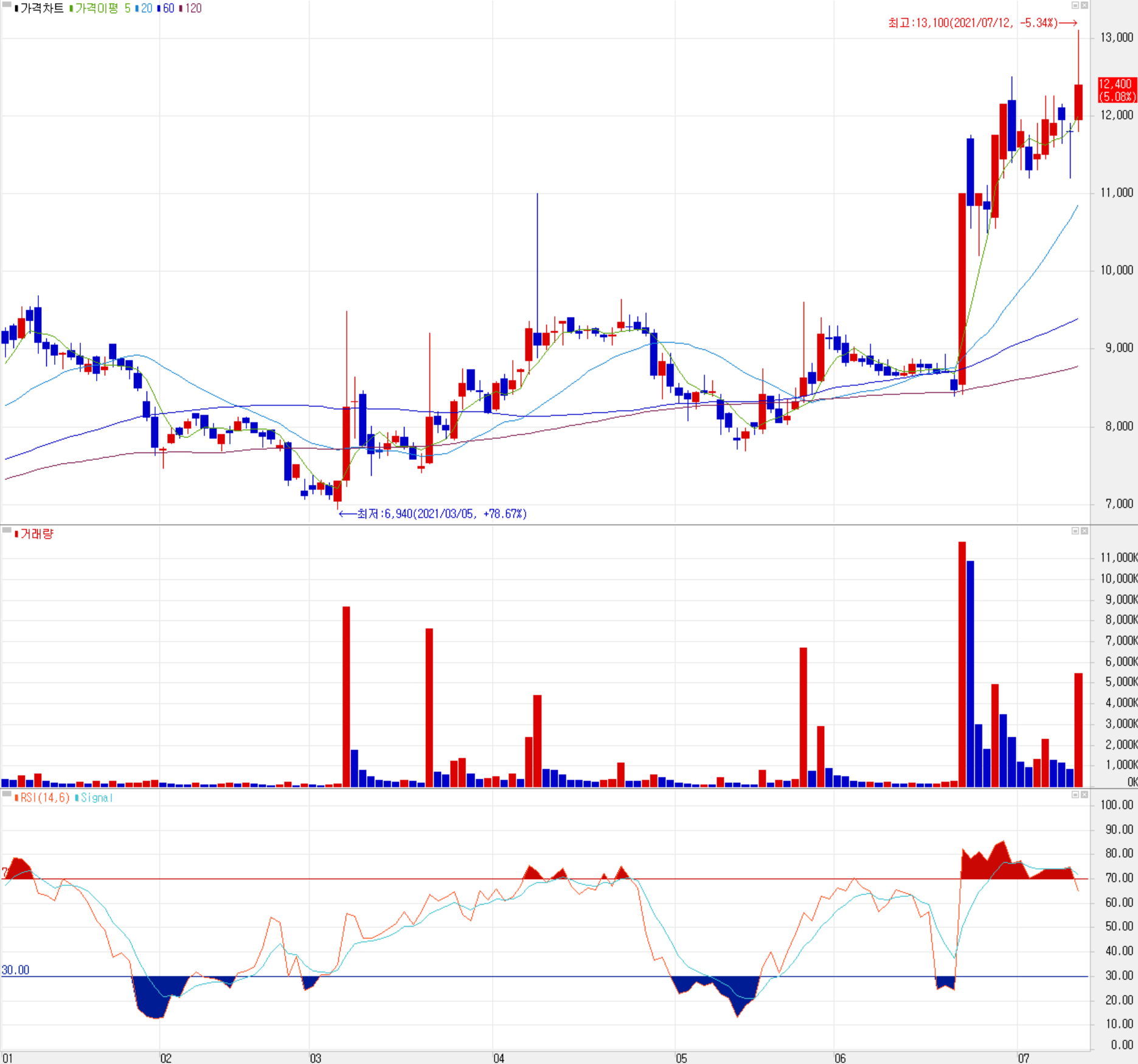 최근 당사의 주가는 지난 6월 22일 2022년 대선을 앞두고 예비 후보들의 화두로 메타버스가 거론되면서 당사의 주가는 가격제한폭까지 오르면서 급등했고 최근까지 상승세를 이어오고 있습니다. 따라서 지난 분석 당시 목표주가인 9,500원을 단숨에 넘어서면서 현재 주가는 13,000원 대를 형성하고 있습니다. 차트 소견 상 개인적인 목표주가는 14,000원으로 설정하였으나, 당분간 관망할 예정이며 급등에 따른 조정 시 재 진입을 고려 중에 있습니다.