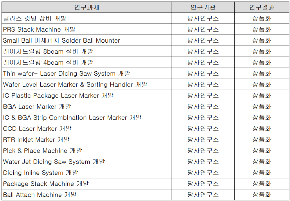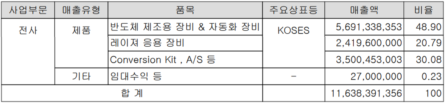 당사는 반도체 및 디스플레이 공정용 장비를 생산하는 단일 사업부문으로 주로 반도체 후공정에 적용되는 Ball Attach, Marking System, PKG stack System 등이 있으며, 디스플레이 공정에는 세계 유일의 리페어 시스템과 디스플레이, 모바일 등 IT 제품이 널리 사용되는 레이저 응용 기술 기반의 시스템을 제조, 공급하고 있습니다.