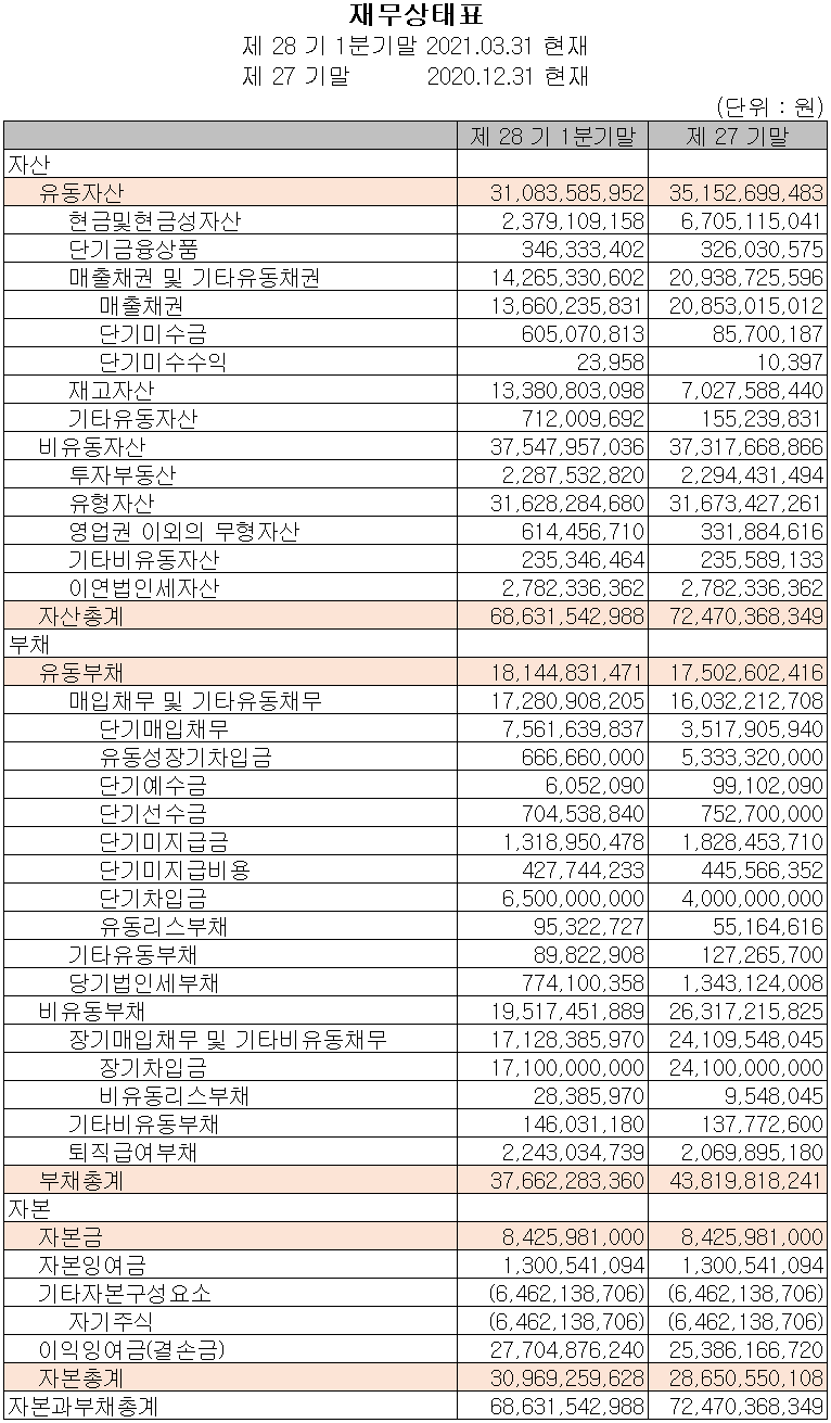지난 1분기 자산 총계는 전기보다 5.3%(38억 원) 감소한 686억 원으로 현금 및 현금성 자산과 매출 채권의 감소에 기인합니다. 부채는 14.1%(62억 원) 감소한 377억 원으로 차입금의 감소가 있었습니다.