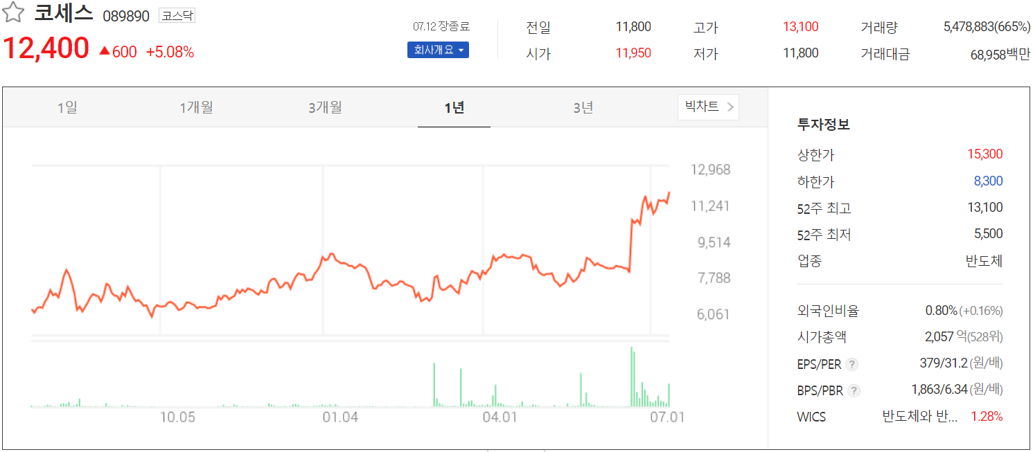 7월 12일 장 종료 기준 당사의 주가는 전 거래일보다 5.08% 오른 12,400원에 거래를 마쳤습니다. 외국인 비중은 0.8%이며, 시가 총액 2,057억 원으로 코스닥 시총 상위 528위 종목입니다.