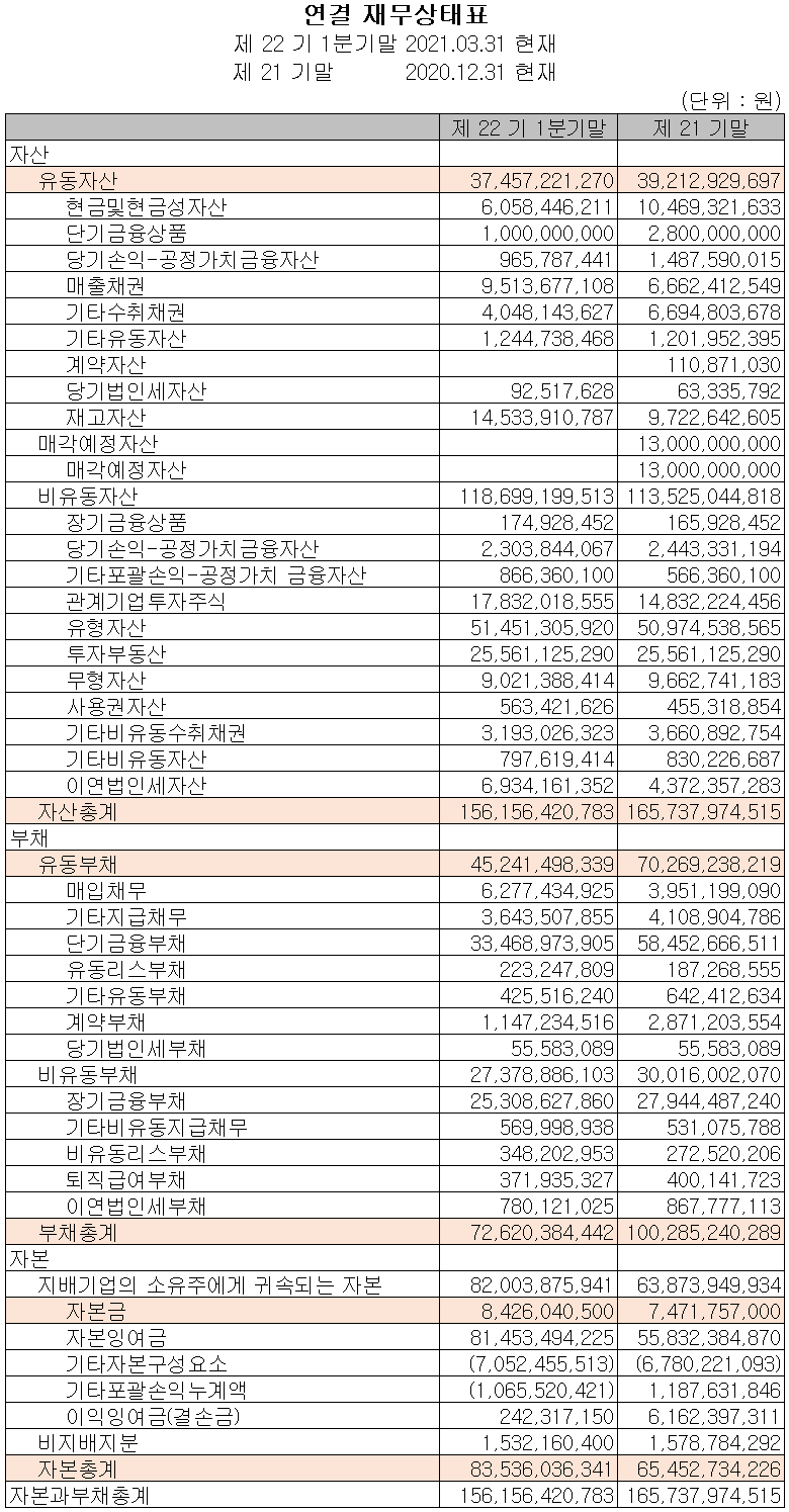 지난 1분기 말 기준 자산 총계는 전기보다 5.8%(96억 원) 감소한 1,562억 원으로 현금성 자산, 단기금융상품, 수취채권 등의 감소에 기인합니다. 부채는 27.6%(277억 원) 감소한 726억 원으로 장단기 금융부채 및 계약 부채의 감소가 있었습니다.