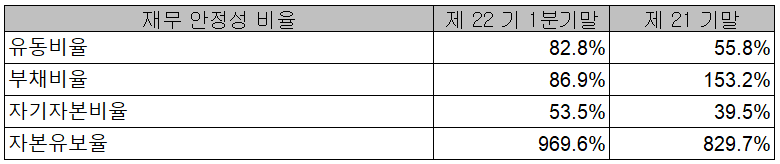 2021년 1분기 재무 안정성 비율에서는 유동비율 82.8%, 부채비율 86.9%, 자기자본비율 53.5%, 자본 유보율 969.6%를 기록하였습니다. 당기 중 부채 비율이 감소하면서 100% 이하로 떨어졌고, 당사의 자회사를 통한 전력반도체 수주가 증가 추세에 있으며, 디스플레이 전방산업의 투자 재개가 이루어지면서 전반적으로 코로나19에서 벗어나면서 실적 개선도 꾸준할 것으로 판단됩니다.