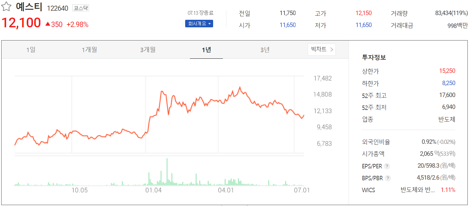 7월 13일 장 종료 기준 당사의 주가는 전일보다 2.98% 오른 12,100원에 거래를 마감했습니다. 외국인 비중은 0.92%이며, 시가 총액은 2,065억 원으로 코스닥 시총 상위 533위 종목입니다.