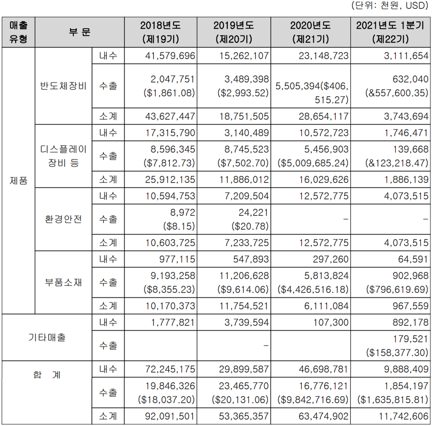 당사의 지난 1분기 전체 실적에서 내수와 수출의 비중은 각각 78.4%, 21.6%를 기록했습니다.