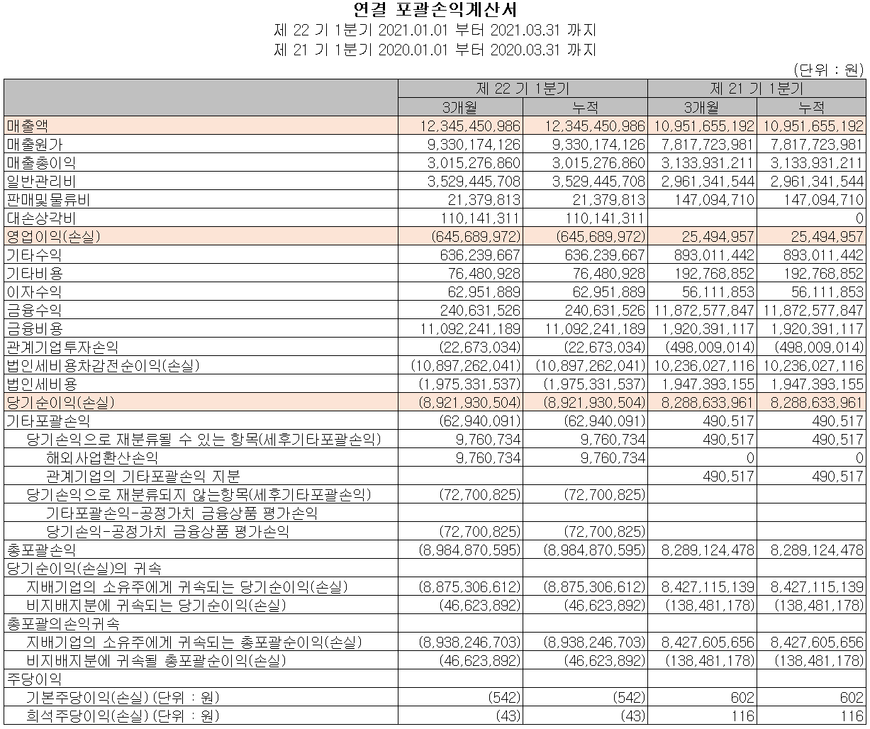 당사의 지난 1분기 실적은 매출액 123억 원으로 전년 동기 대비 12.7% 증가했고, 영업 손실 6.4억 원, 당기순손실 89억 원으로 적자 전환했습니다. 전년 동기 대비 매출액은 증가했으나, 판관비 및 매출원가 부담에 따른 영업 적자가 발생했고, 일회성 파생상품 평가 손실이 104억 원 발생하면서 당기순손실 규모가 증가했습니다.