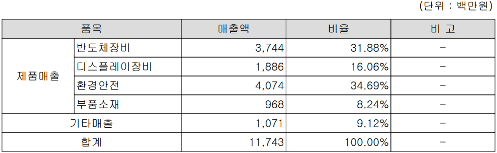 당사의 주요 제품은 반도체 생산 공정과 디스플레이 패널 생산 공정에 적용되는 열처리, 온도제어 및 검사장비 그리고 환경 안전부문 및 부품 소재 등으로 구성되어 있습니다. 지난 1분기 반도체 장비 부문 매출은 37억 원으로 전채 매출의 31.88%를 차지하였으며, 디스플레이 장비는 19억 원으로 16.06%, 환경안전 부문은 41억 원으로 34.69%, 부품 소재 부문에서는 9.7억 원으로 8.24%의 매출 비중을 나타냈습니다.