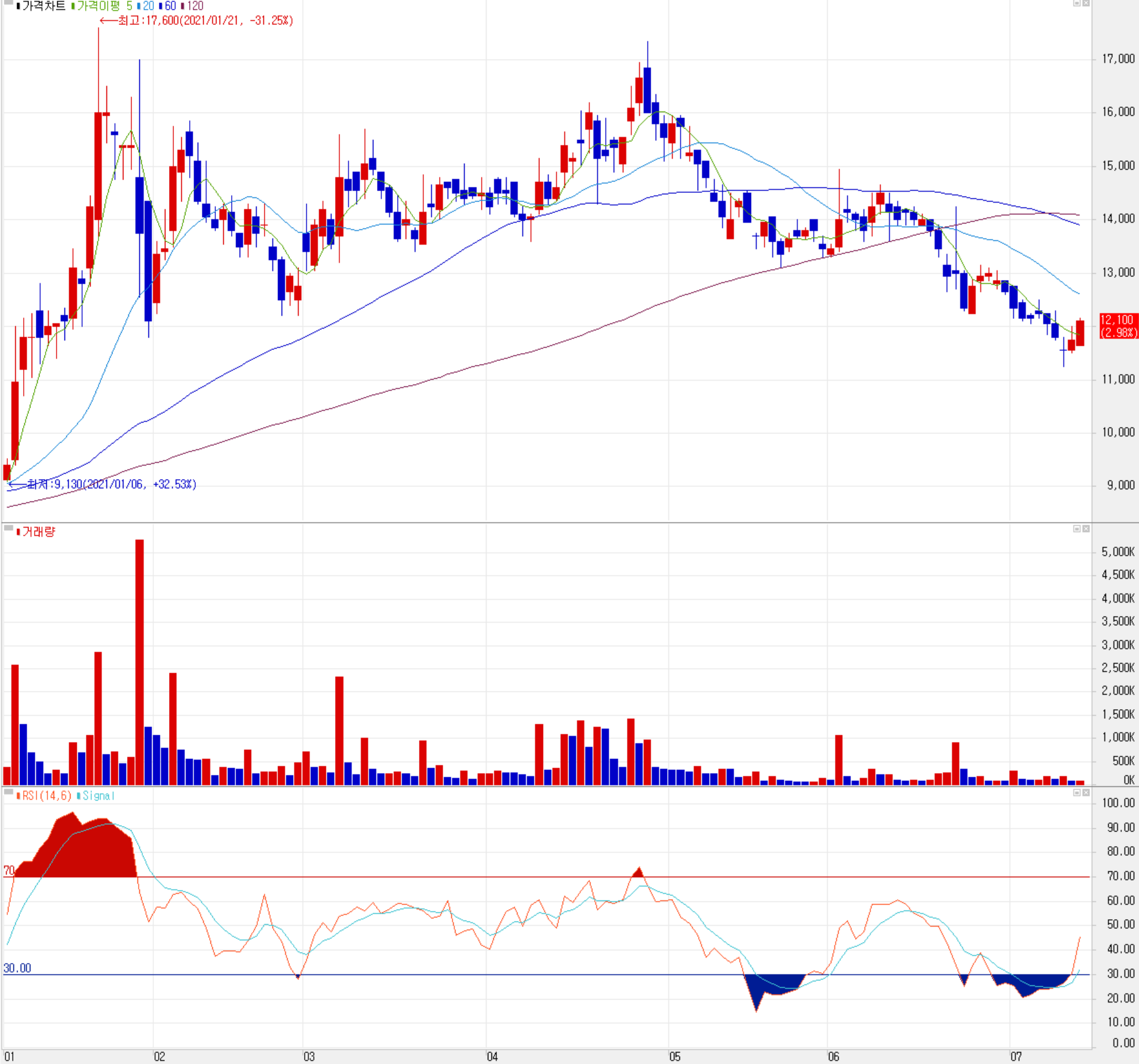 7월 13일 장 종료 기준 당사의 주가는 전일보다 2.98% 오른 12,100원에 거래를 마감했습니다. 외국인 비중은 0.92%이며, 시가 총액은 2,065억 원으로 코스닥 시총 상위 533위 종목입니다.