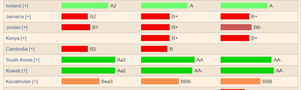 위 사이트에서 각국명을 클릭하면 3대 신용평가사(Moody's, S&P, Fitch)의 자세한 정보를 볼 수 있습니다.