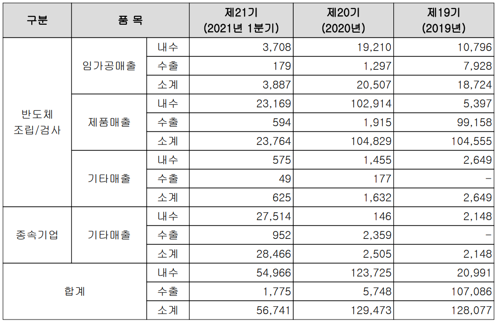 당사는 설립 당시 SK하이닉스의 테스트 연구실에서 분사하여 반도체 검사 전문 업체로 출범하였으며, 2014년에는 세미텍과의 합병을 통해 반도체 패키징(조립) 사업에 진출하였습니다. 임가공 매출은 반도체 웨이퍼 및 패키지 상태를 검사, 분석하는 부문이며, 제품 매출은 반도체 조립 공정에 해당되는 매출입니다. 지난 1분기 임가공 매출은 39억 원으로 전체 매출의 14%를 차지하였으며, 제품 매출의 경우 238억 원으로 83%의 매출 비중을 기록했습니다. 당사 전반적인 실적에서 내수와 수출의 비중은 각각 97%, 3%를 기록했습니다.