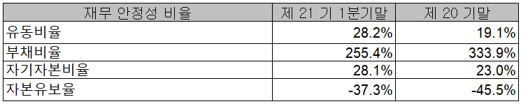 2021년 1분기 당사의 재무 안정성 비율에서는 유동비율 28.2%, 부채비율 255.4%, 자기 자본비율 28.1%, 자본 유보율 37.3%를 기록하였습니다. 2019년부터 실적 부진과 진천 공장의 설비 투자가 이어지면서 재무상태도 악화하여 1분기 현재 자본잠식률 30.9%로 자본잠식 상태에 있습니다. 반면, 당사는 지난 5월 무상감자를 실시하면서 자본잠식 상태를 해소했다고 밝혔습니다. 또한 유상증자를 통해 약 300억 원 규모의 자금을 융통하여 시설자금, 운영자금 및 채무 상환자금 등으로 사용할 예정에 있습니다. 당사는 지난 2019년부터 약 732억 원 규모를 진천 공장에 투자하였고, 기타 지분투자에 100억 원이 넘는 규모를 투자하면서 수익성 증대 및 사업 다각화를 위한 투자를 진행하면서 금융비용에 대한 압박을 받는 상태입니다.