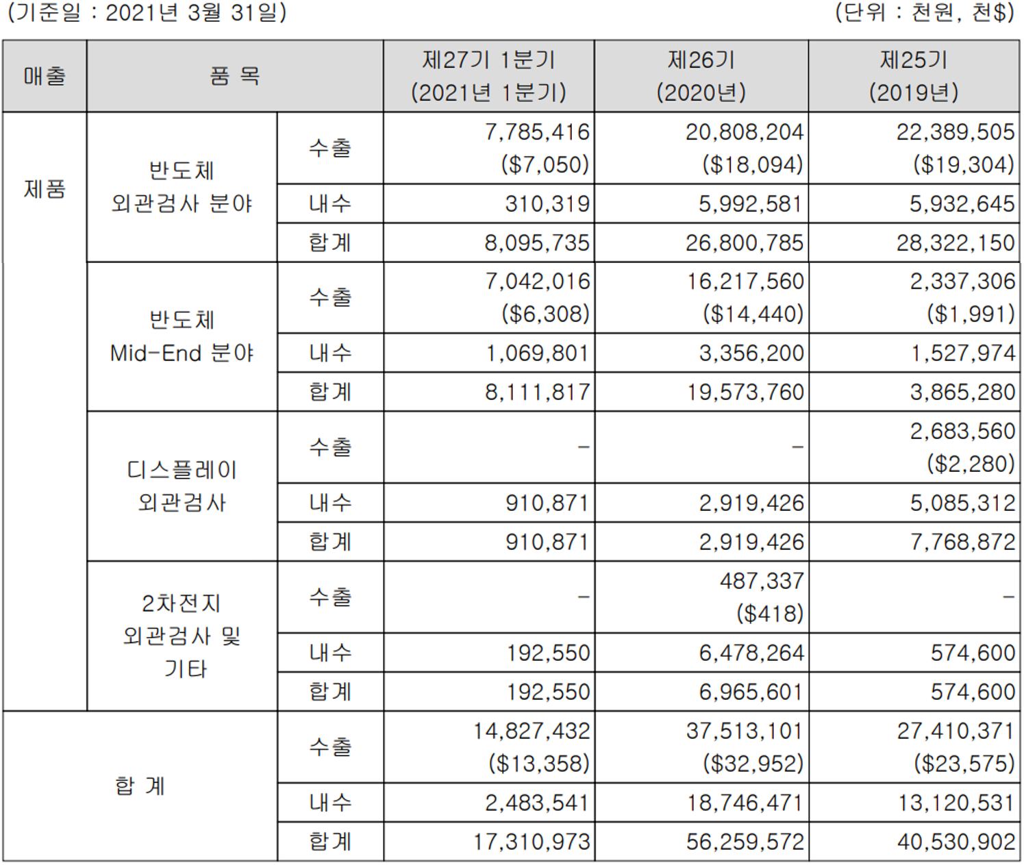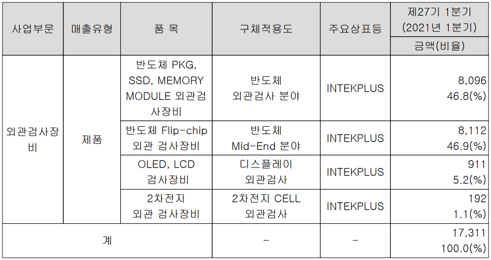 당사는 2D, 3D 검사 기술 및 자동화 장비 제작 기술 그리고 고속 영상 처리 기술 기반으로 반도체, OLED 디스플레이, 2차 전지 등의 외관 검사장비를 제조, 공급하고 있습니다. 지난 1분기 당사의 주력 사업인 반도체 부문 매출은 162억 원으로 전체 분기 매출의 93.7%를 차지하였으며, OLED/LC 외관 검사장비는 9억 원의 매출로 5.2%, 2차 전지 외관 검사장비의 경우 1.9억 원의 매출로 1.1%의 매출 비중을 나타냈습니다.