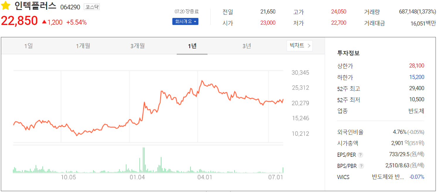 7월 20일 장 종료 기준 당사의 주가는 전일보다 5.54% 오른 22,850원에 거래를 마감했습니다. 외국인 비중은 4.76%이며, 시가 총액 2,901억 원으로 코스닥 시총 상위 351위 종목입니다.