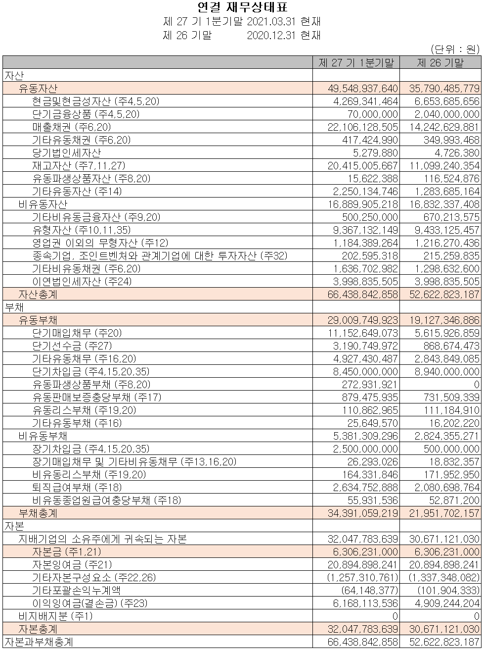 당사의 지난 1분기 자산 총계는 전기 보다 26.3%(138억 원) 증가한 664억 원으로 매출 채권 및 재고 자산의 증가에 기인합니다. 부채는 56.7%(124억 원) 증가한 344억 원으로 장단기 차입금 및 유동성 채무의 증가가 있었습니다.