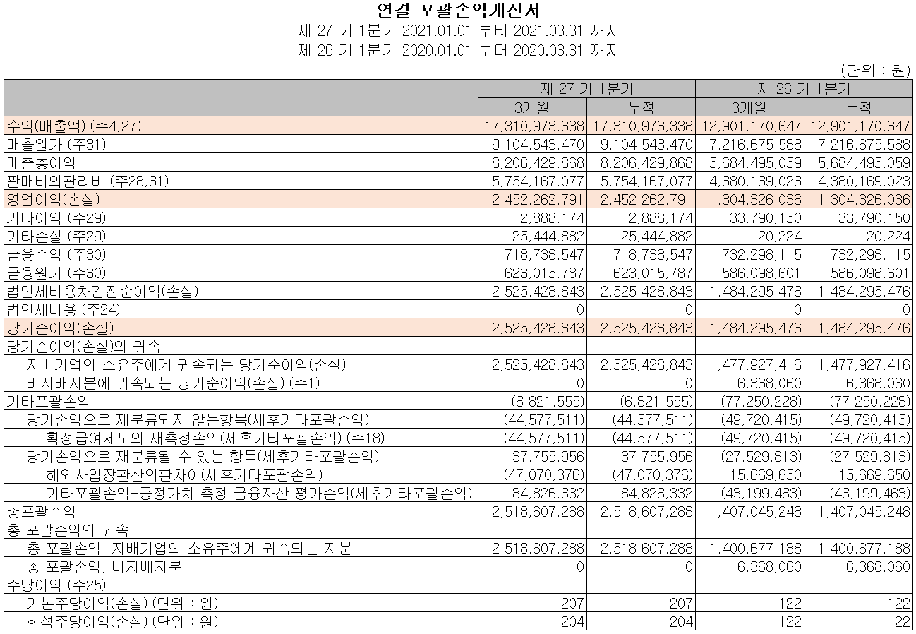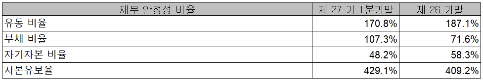 2021년 1분기 재무 안정성 비율에서는 유동비율 170.8%, 부채비율 107.3%, 자기 자본비율 48.2%, 자본 유보율 429.1%를 기록하였습니다. 부채 비율의 증가는 주로 단기성 매입 채무(55억)와 장기 차입금(25억)의 증가로 부담될 요인은 아닌 것으로 판단됩니다.