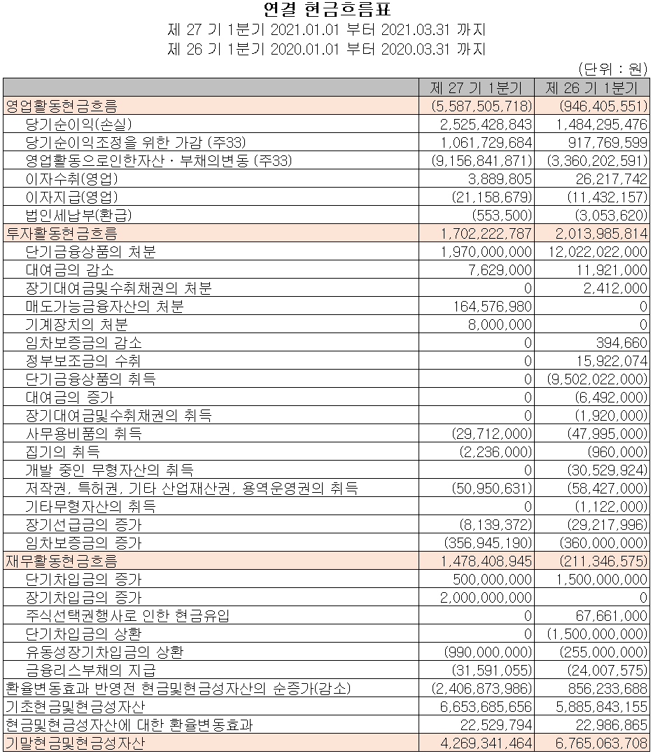 지난 1분기 영업활동 현금흐름에서는 당기순이익 등의 유입이 있었으나 운전자산의 변동에 따라 총 56억 원의 현금이 유출되었습니다. 재무 활동에서는 차입금을 조달하여 부채를 상환했고, 투자활동에서는 금융상품의 처분 등으로 17억 원의 현금이 유입되었습니다. 2021년 1분기 말 기준 현금 및 현금성 자산은 전년 동기 대비 25억 원 감소한 43억 원을 보유하고 있습니다.