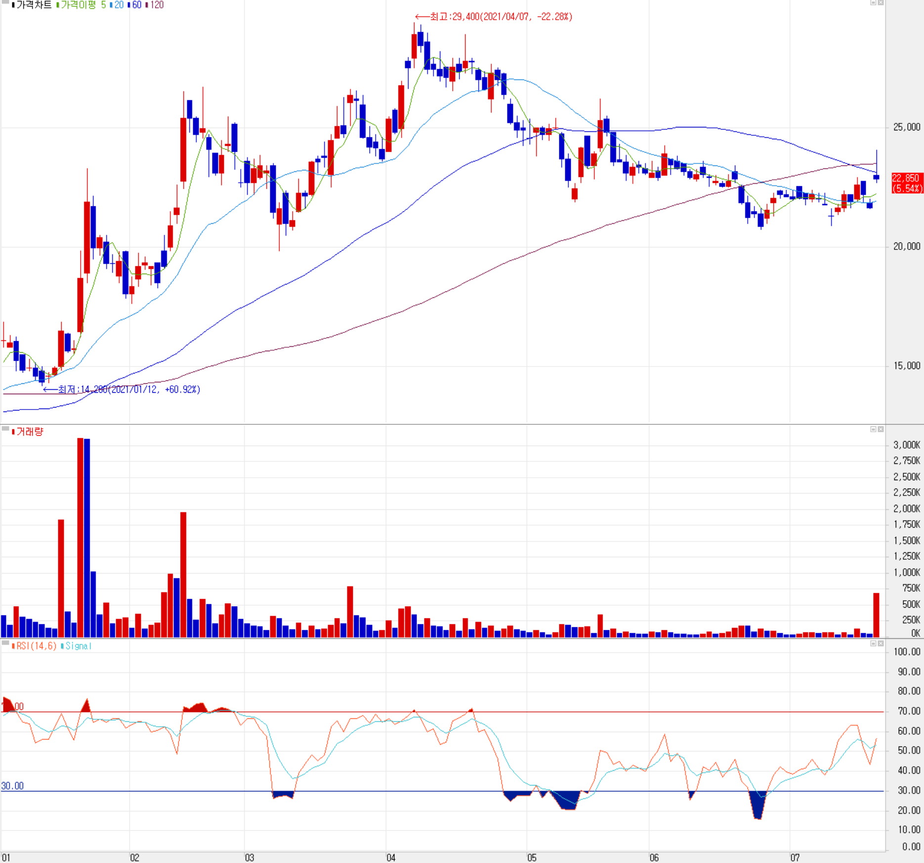 7월 20일 장 종료 기준 당사의 주가는 전일보다 5.54% 오른 22,850원에 거래를 마감했습니다. 외국인 비중은 4.76%이며, 시가 총액 2,901억 원으로 코스닥 시총 상위 351위 종목입니다.