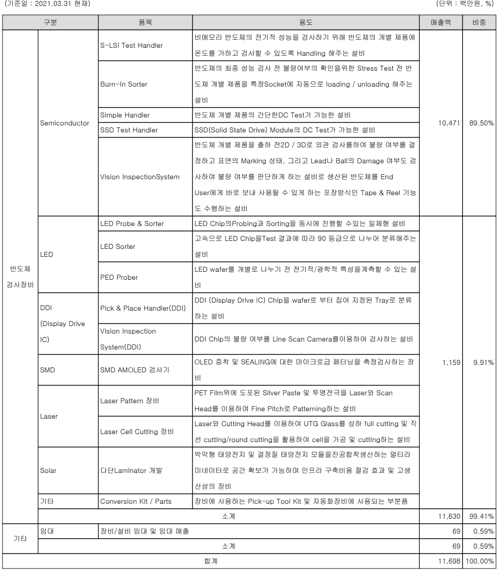 당사는 반도체 번인소터, 메모리 및 비메모리 테스트 핸들러, 비전 검사 장비 등을 중심을 디스플레이 LED용 프로브 및 소터와 태양전지 모듈을 진공 합착 생산하는 멀티 라미네이터 등을 제조, 공급하고 있습니다.