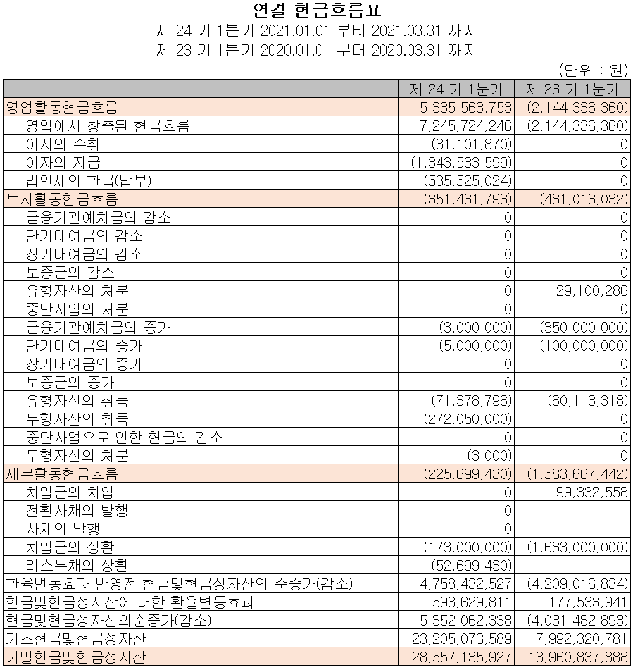 당사의 지난 1분기 영업활동 현금흐름에서는 총 53억 원의 현금이 유입되었으며, 부채를 상환했고 유무형 자산의 취득이 있었습니다. 2021년 1분기 말 기준 현금 및 현금성 자산은 전년 동기 대비 146억 원 증가한 286억 원을 보유하고 있습니다.
