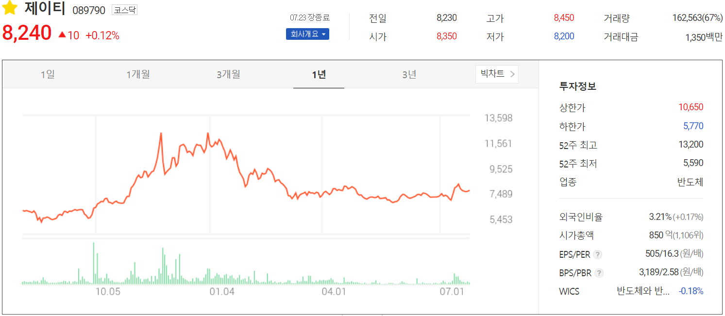 7월 23일 장 종료 기준 당사의 주가는 전일보다 0.12% 오른 8,240원에 거래를 마감했습니다. 외국인 비중은 3.21%이며, 시가 총액 850억 원으로 코스닥 시총 상위 1,106위 종목입니다.