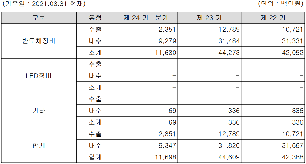 당사의 지난 1분기 반도체 장비 관련 매출은 105억 원으로 전체 매출의 89.5%를 차지하였으며, 디스플레이 및 태양전지 제조 관련 장비의 매출은 12억 원으로 9.91%의 매출 비중을 나타냈습니다.