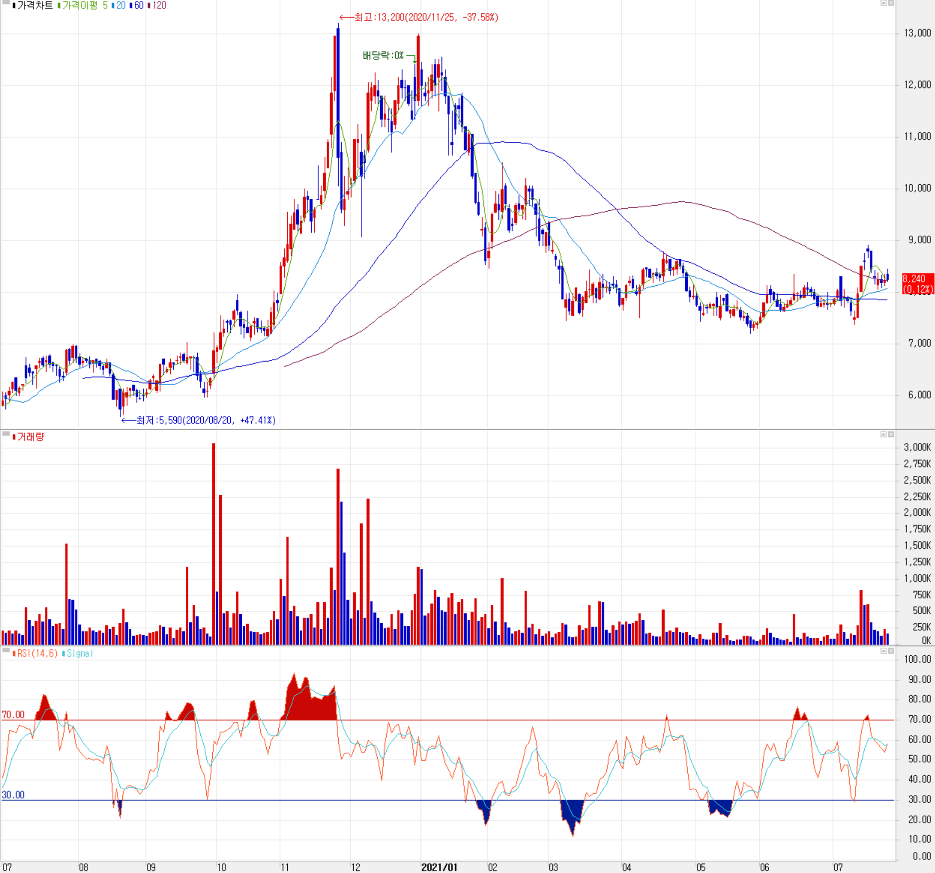 7월 23일 장 종료 기준 당사의 주가는 전일보다 0.12% 오른 8,240원에 거래를 마감했습니다. 외국인 비중은 3.21%이며, 시가 총액 850억 원으로 코스닥 시총 상위 1,106위 종목입니다.
