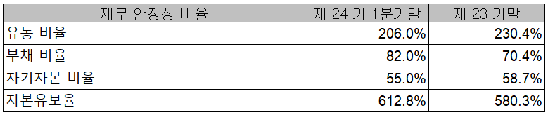 2021년 1분기 재무 안정성 비율에서는 유동비율 206%, 부채비율 82%, 자기 자본비율 55%, 자본 유보율 612.8%를 기록했습니다. 제품 생산을 위한 매입채무 등으로 인해 부채 비율이 증가하였으나, 구조적 재무 문제는 양호한 것으로 판단됩니다.