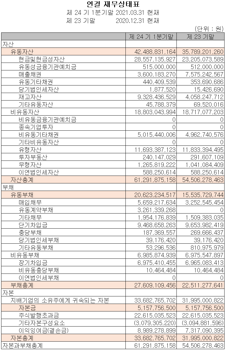 지난 1분기 자산 총계는 전기보다 12.4%(68억 원) 증가한 613억 원으로 현금 및 현금성 자산의 증가에 기인합니다. 부채는 22.6%(51억 원) 증가한 276억 원으로 매입채무, 유동성 계약 부채 등의 증가가 있었습니다.