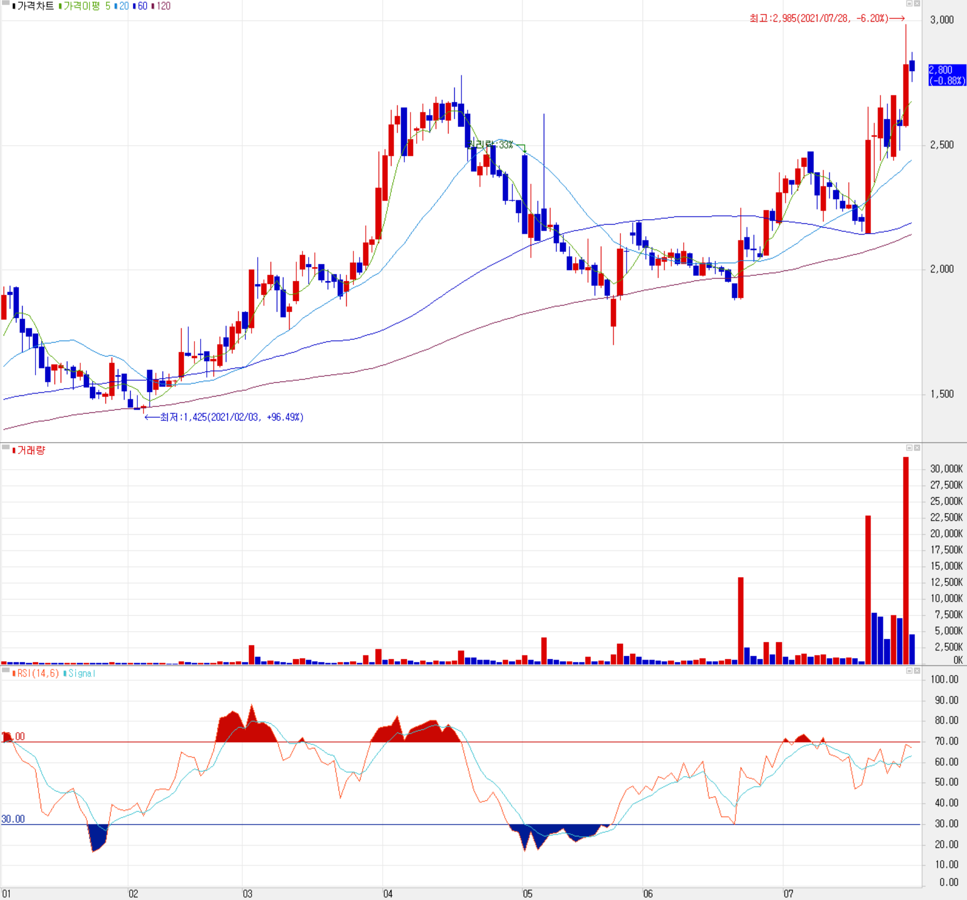 7월 29일 장 종료 기준 당사의 주가는 전 거래일보다 0.88% 내린 2,800원에 거래를 마쳤습니다. 외국인 비중은 0.8%이며, 시가총액 1,623억 원으로 코스닥 시총 상위 654위 종목입니다.