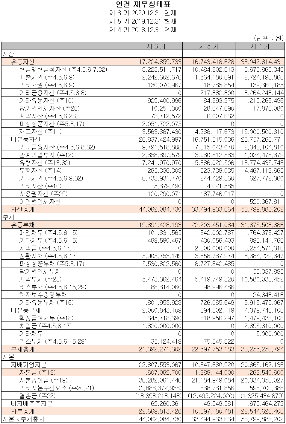 당사의 지난 2020년 기말 기준 자산 총계는 전년 대비 31.5%(106억 원) 증가한 441억 원으로 주로 종속회사인 한국미디어테크의 영업활동을 위한 장기대여금, 토지 및 건물 취득과 융복합 신규사업을 위한 보증금 등의 증가가 있었습니다. 부채는 5.3%(12억 원) 감소한 214억 원으로 차입금 및 파생상품 부채의 감소에 기인합니다. 자본 총계는 108%(118억 원) 증가한 227억 원으로 전환청구권 행사 등이 있었습니다.