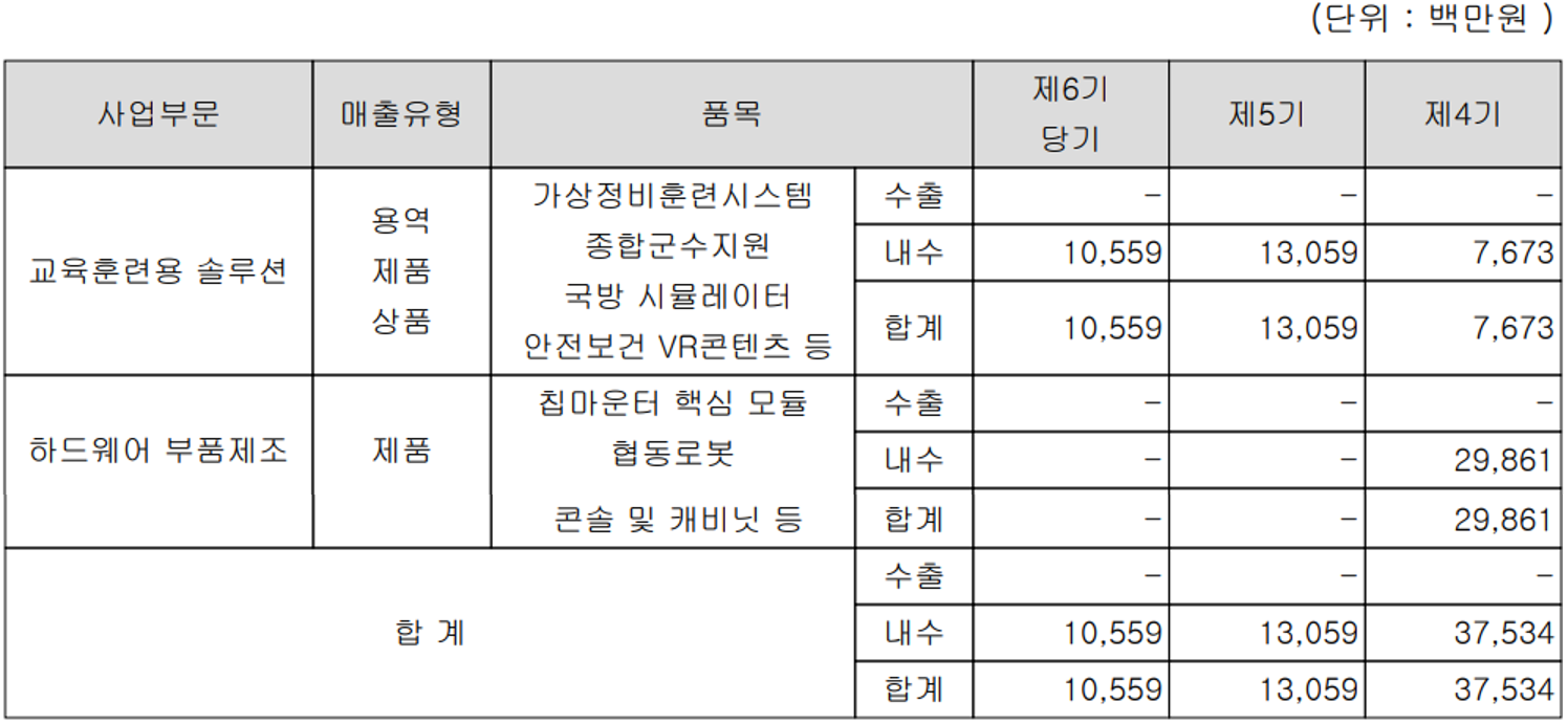 당사 및 당사의 종속기업은 VR 기반의 훈련용 시뮬레이션 및 방위산업에 속하는 무기체계의 종합군수지원사업 등 국방 솔루션과 다양한 분야의 산업용 및 국방/항공 하드웨어를 개발하여 공급하고 있습니다.