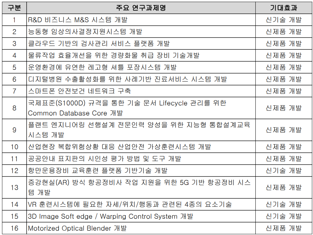 | 2020.05 | 정부 과제 "증강현실(AR) 방식 항공정비사 작업 지원을 위한 5G 기반 항공정비 시스템 개발" 주관기관 선정 |