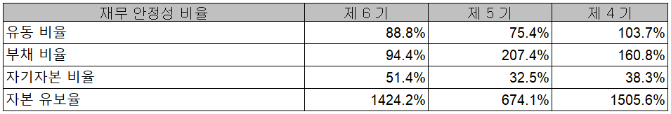 2020년 당기 말 기준 당사의 재무 안정성 비율에서는 유동비율 88.8%, 부채비율 94.4%, 자기 자본비율 51.4%, 자본 유보율 1,424.2%를 기록하면서 부채비율이 감소하면서 전반적으로 양호한 흐름을 보이고 있습니다.