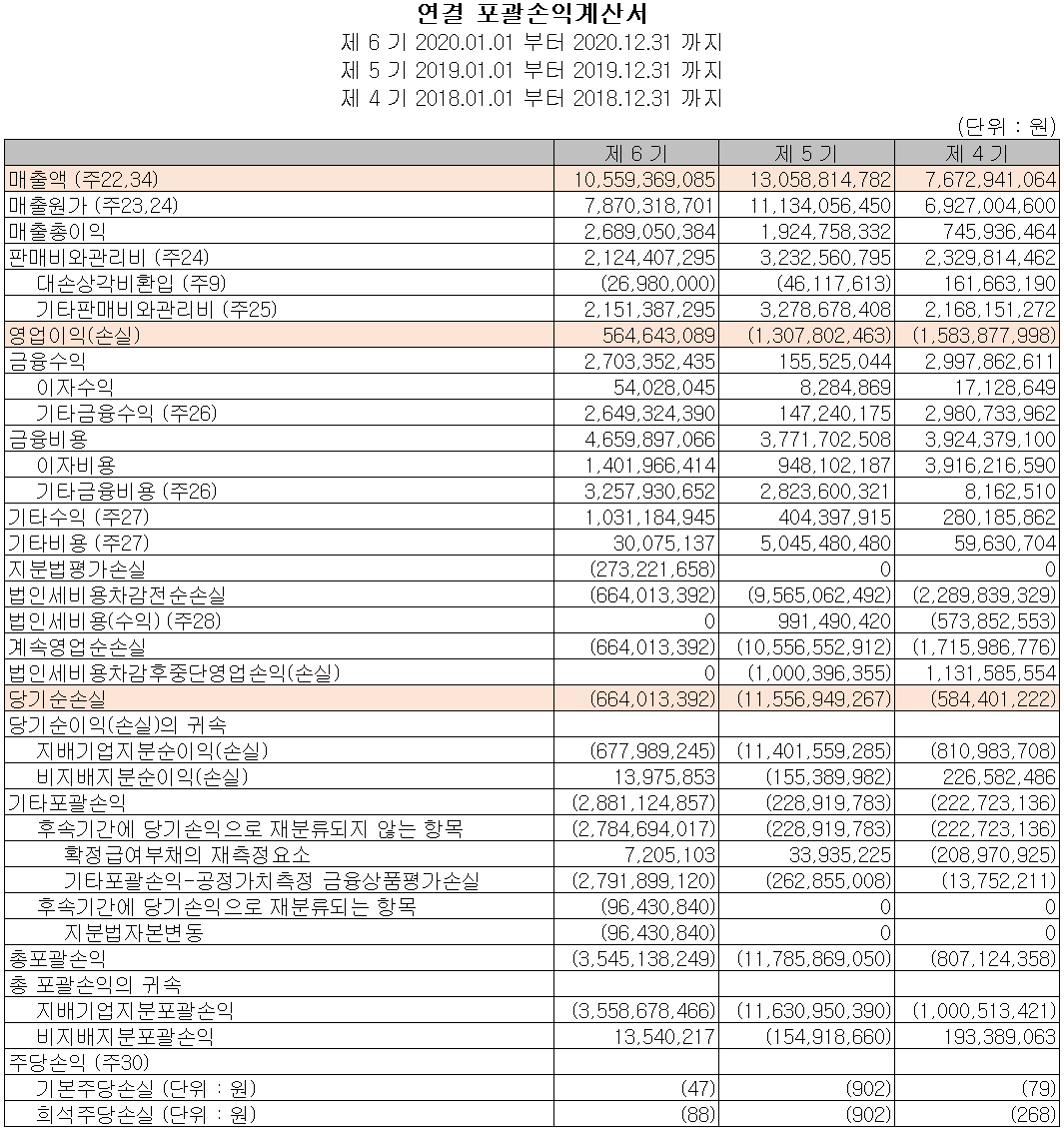 2020년 당사의 실적은 매출액 106억 원으로 전년 대비 19.1% 감소했고, 영업이익 5.6억 원으로 흑자전환, 당기순손실 6.6억 원으로 적자 지속입니다. 2020년 코로나19 팬데믹으로 인한 실적 감소가 있었으나 프로젝트 수익성 비용 관리 등 내부 효율화에 따라 영업 흑자를 달성하였습니다. 또한 전환사채 상환손실에 따른 기타 금융비용(32억 원)의 발생으로 당기순손실이 발생하였으나, 미전환사채의 금액도 꾸준히 감소하고 있으므로 향후 당기순이익 전환이 기대되고 있습니다.