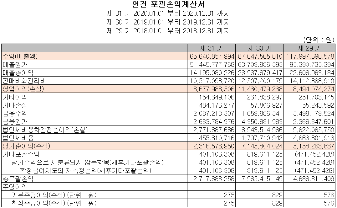 당사의 2020년 실적은 매출액 656억 원으로 전기 대비 25.1% 감소했고, 영업이익은 37억 원으로 67.8% 감소, 당기순이익은 23억 원으로 67.6% 감소했습니다. 코로나19의 영향으로 전방 업체의 투자가 지연되면서 실적이 부진했습니다.