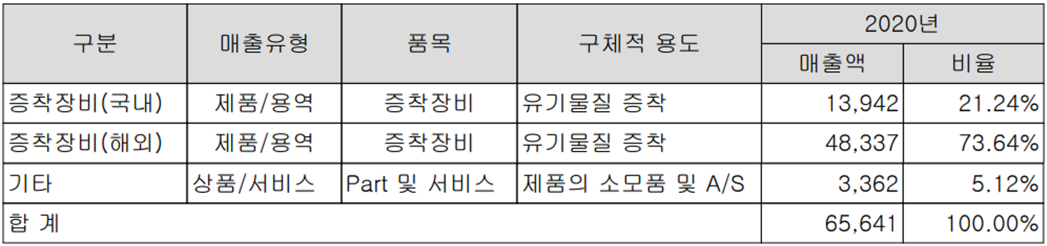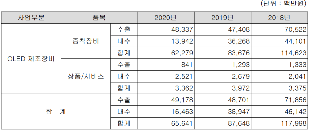 당사는 디스플레이 증착 장비 및 관련 부품의 제조, 공급을 하는 단일 사업부문으로 구성되어 있습니다. 지난 2020년 증착 장비의 매출 중 장비 매출은 623억 원으로 94.88%의 비중을 나타냈으며, 기타 관련 부품 및 서비스 용역 등으로 매출액 34억 원으로 5.12%의 매출 비중을 기록했습니다.