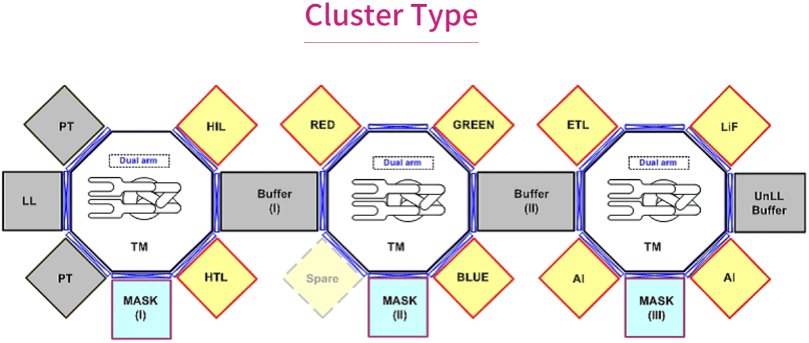 Cluster Type에서는 중앙에 Transfer Module(TM)을 기준으로 각각의 공정 챔버(전자층, 전공층, 유기물층 등)를 배치하여 Vacuum Robot으로 물류를 구성하는 방식입니다. 주로 AMOLED 디스플레이 패널 제조라인 및 제품 개발 연구용으로 적용되는 방식입니다.