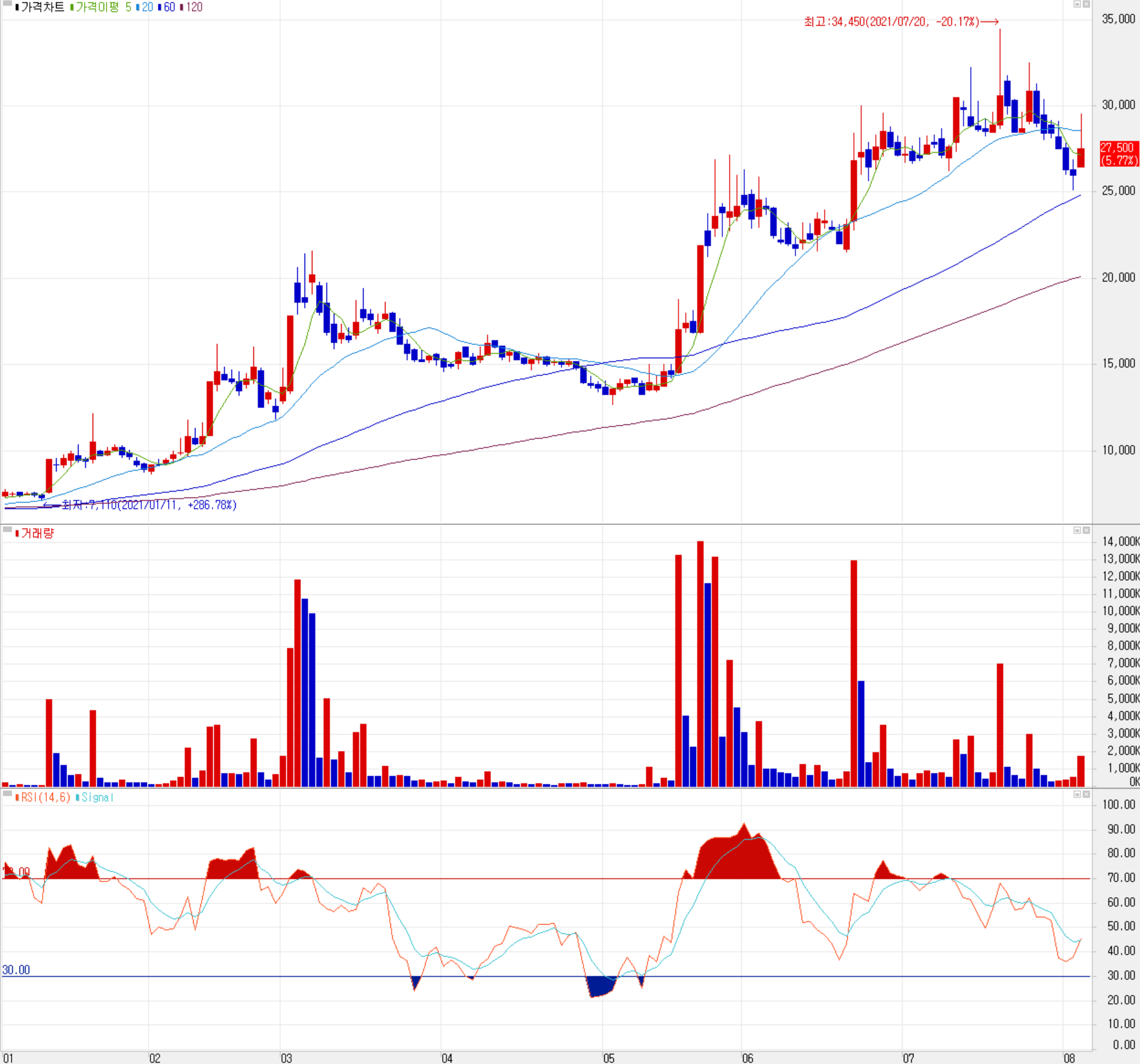 8월 4일 장 종료 기준 당사의 주가는 전 거래일보다 5.77% 오른 27,500원에 거래를 마감했습니다. 외국인 비중은 0.24%이며, 시가 총액 2,486억 원으로 코스닥 시총 상위 436위 종목입니다.