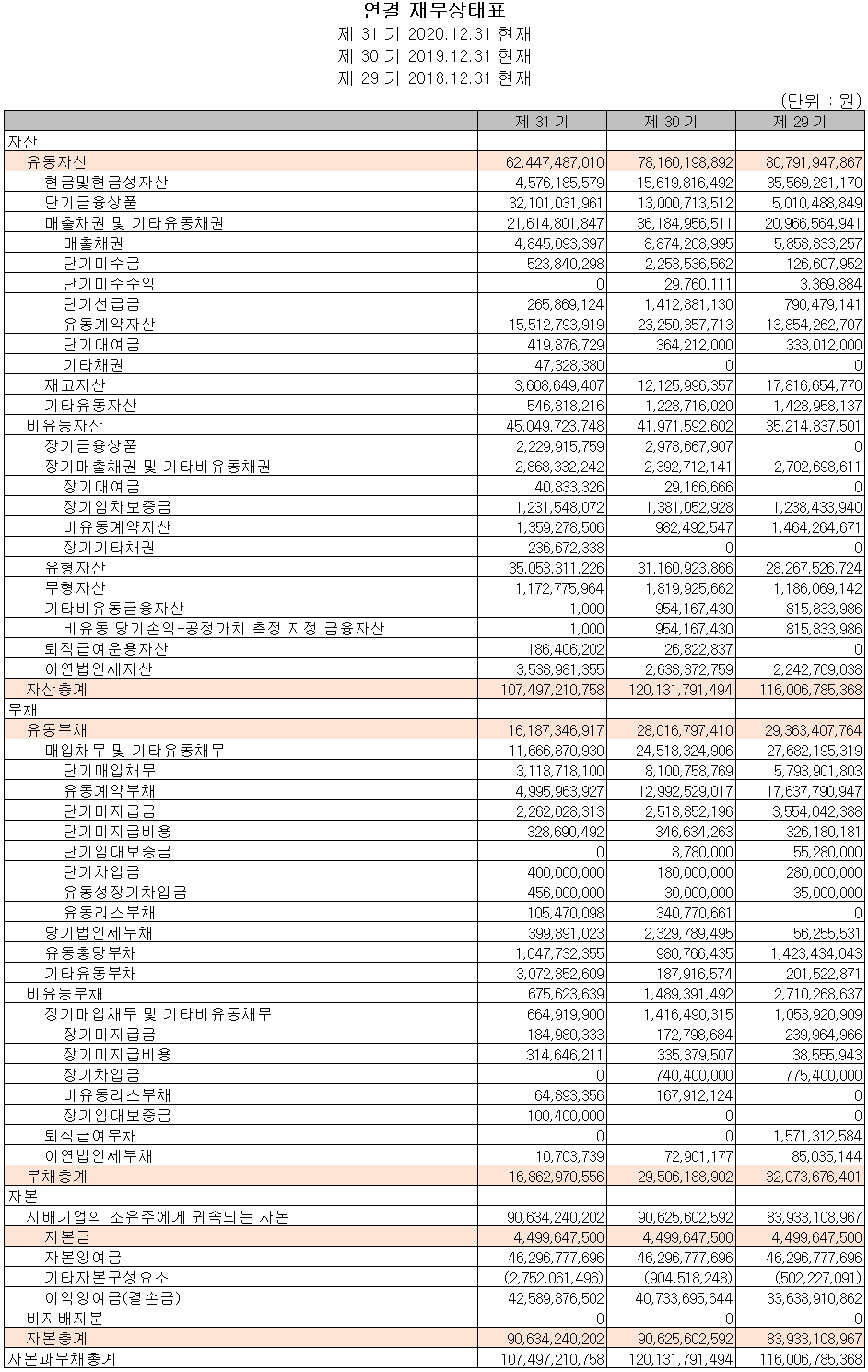 지난 2020년 당기 말 기준 자산 총계는 전기보다 10.5%(126억 원) 감소한 1,075억 원으로 현금 및 현금성 자산, 매출 채권, 유동계약자산 및 재고 자산 등의 감소에 기인합니다. 부채 총계는 42.8%(126억 원) 감소한 169억 원으로 단기매입채무, 유동계약부채, 단기미지급금 등의 감소가 있었습니다.
