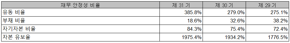 2020년 당기말 기준 재무 안정성 비율에서는 유동비율 385.8%, 부채비율 18.6%, 자기 자본 비율 84.3%, 자본 유보율 1,975.4%를 기록하면서 양호한 재무상태를 유지하고 있습니다.