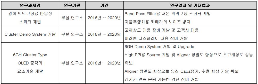 당사의 미래형 디스플레이에 대응하는 장비 개발을 목적으로 고객사에 대응하기 위해 클러스터 데모 설비를 개발하고, 신규 장비의 개발 및 박막 코팅용 스퍼터의 개발 등을 추진하고 있습니다.