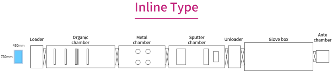 Inline Type은 주로 조명용 OLED 및 W-OLED 기반의 대형 OLED 패널 제조에 사용하는 고생산성, 고효율의 증착장비이며, 고생산성을 위해 레일 구조를 통한 인라인 물류 방식을 적용, Linear Sourcef를 탑재하여 상향 증착방식이 적용됩니다. 다양한 유기소재 및 점 증발원 배열 방식을 통해 무기물 증착도 가능한 장점이 있습니다.