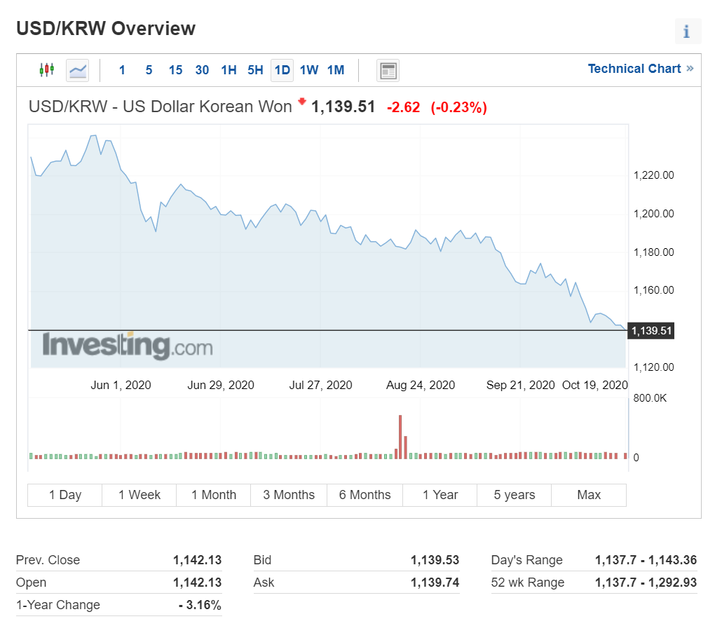 아래 그림을 보시면 지난 1년간 원달러 환율에 대한 추이를 볼 수 있는데, 올해 3월 후반부터 지금까지 계속 원화의 가치는 상승하고 달러 약세인 모습을 볼 수 있습니다. 즉 그래프는 1달러로 살 수 있는 한국 원화의 추이를 표시합니다.
